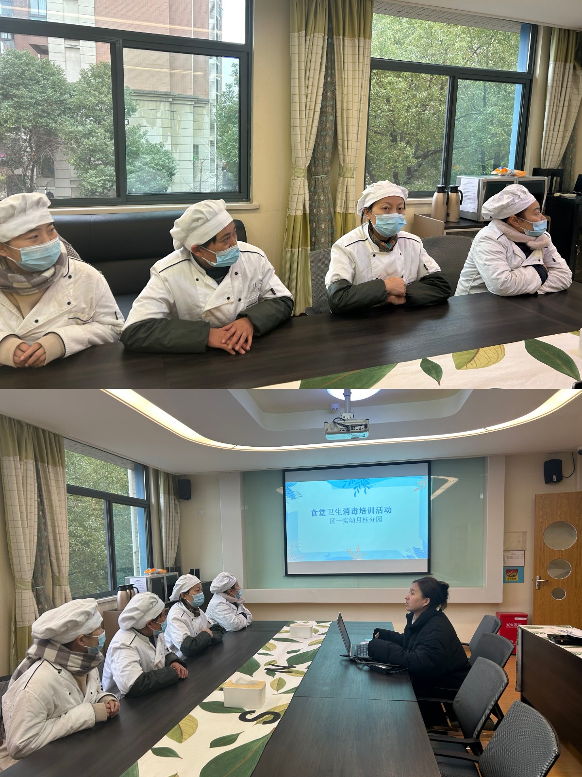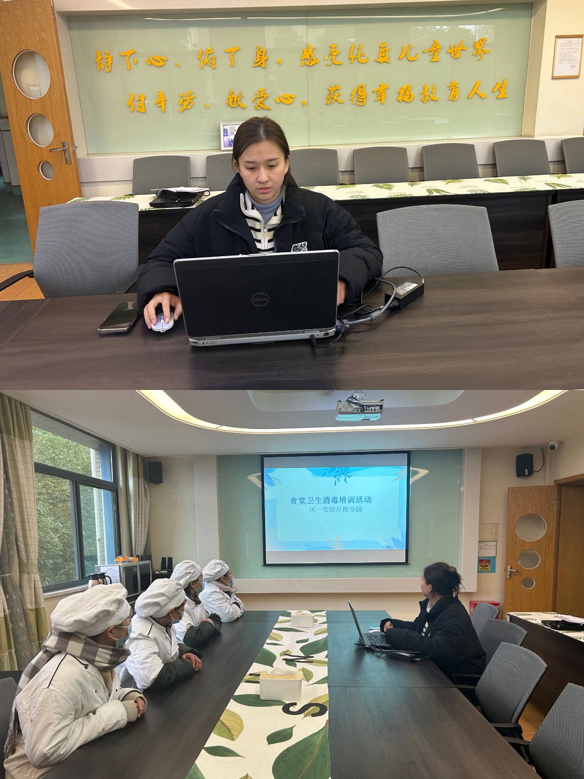 为了加强幼儿园食堂食品安全工作的管理,提升食堂从业人员的食品卫生安全知识,确保全园师幼的饮食安全,保障幼儿健康成长。我园保健朱老师2024年3月4日下午15:00分对食堂工作人员进行了食堂消毒知识培训。