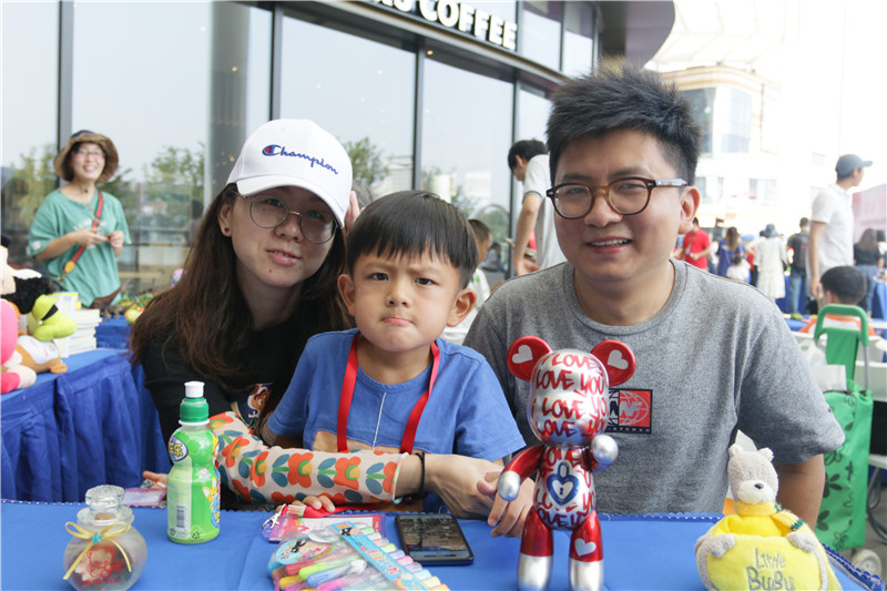 9月7日一大早,孩子们就来到了活动现场——仙林金鹰湖滨天地广场。签到之后,家长和孩子们带着装满义卖品的包裹走向自己摊位,上架宝贝,等待开业。每个家庭的公益摊位都摆满了琳琅满目的物品:闲置的玩具、迷你电扇、学习用品……有的摊位上还挂起了精心制作的义卖海报,还有的打出了“大减价”、“买就送”等促销口号。