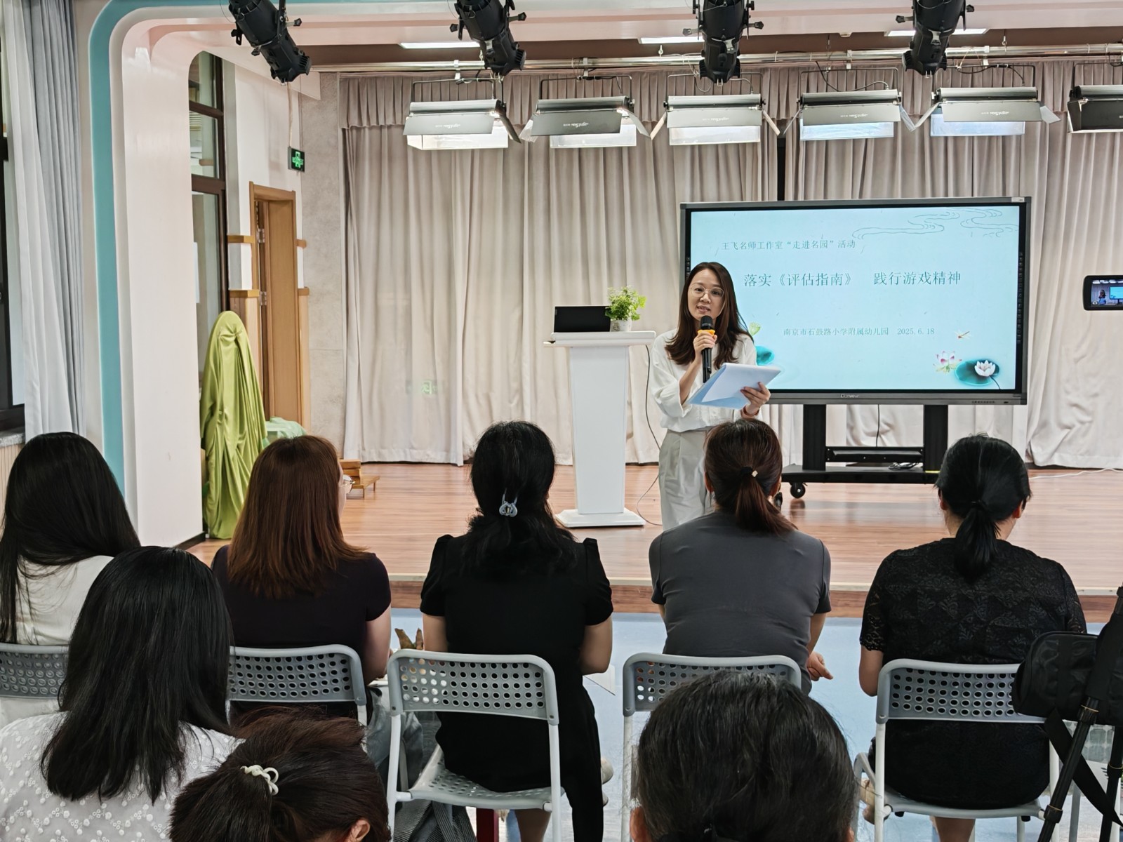 当游戏精神照进教育实践,当艺术创作邂逅生活美学,一场聚焦《评估指南》落地的深度教研在夏日荷香中悄然绽放。2025年6月18日,王飞名师工作室“走进名园”活动在南京市石鼓路小学附属幼儿园展开。本次活动以“落实《评估指南》,践行游戏精神”为核心,通过环境浸润、教学实践、理念升华三维路径,展开了一场有温度、有深度的专业对话。