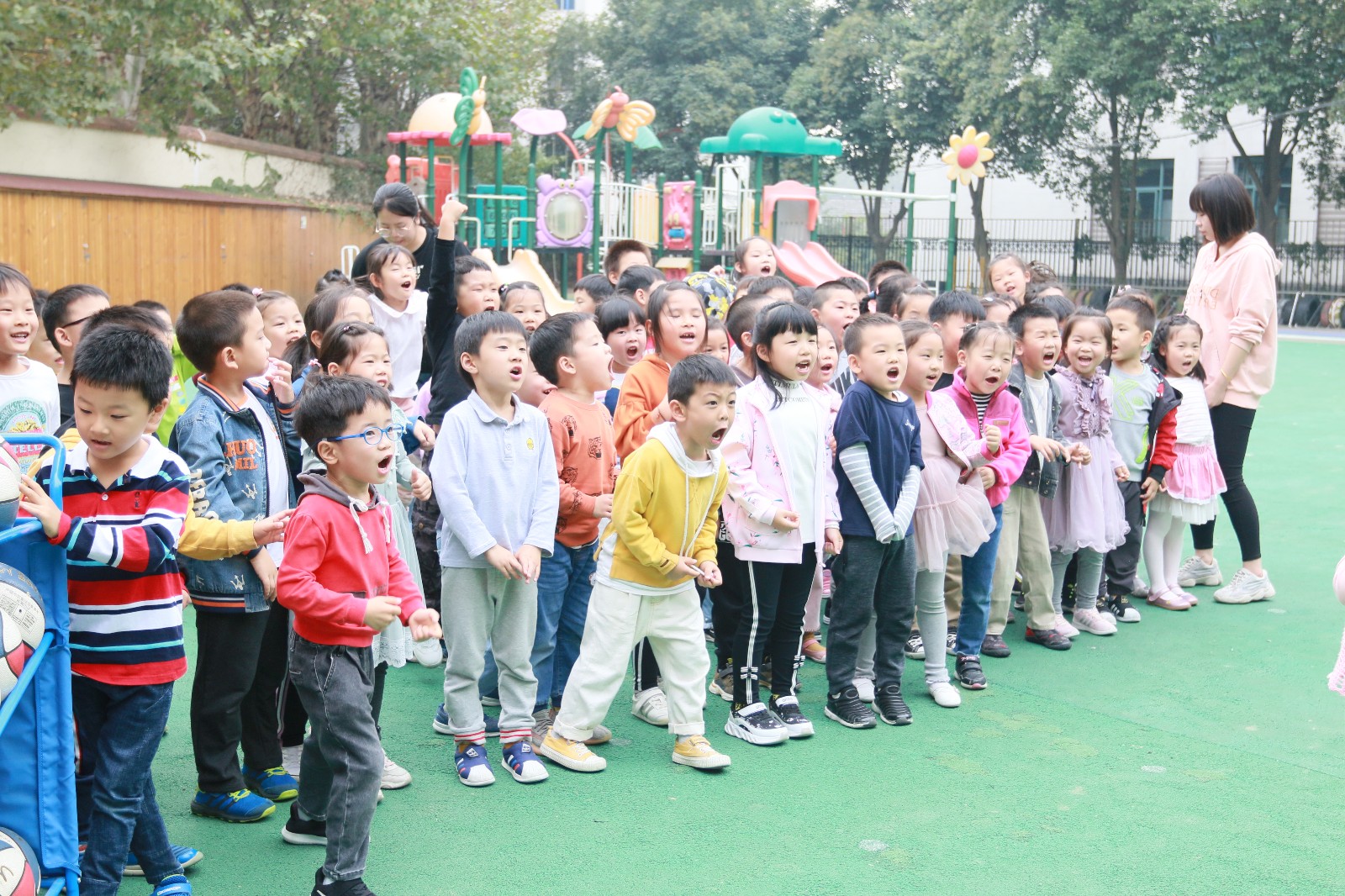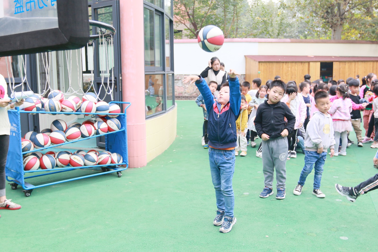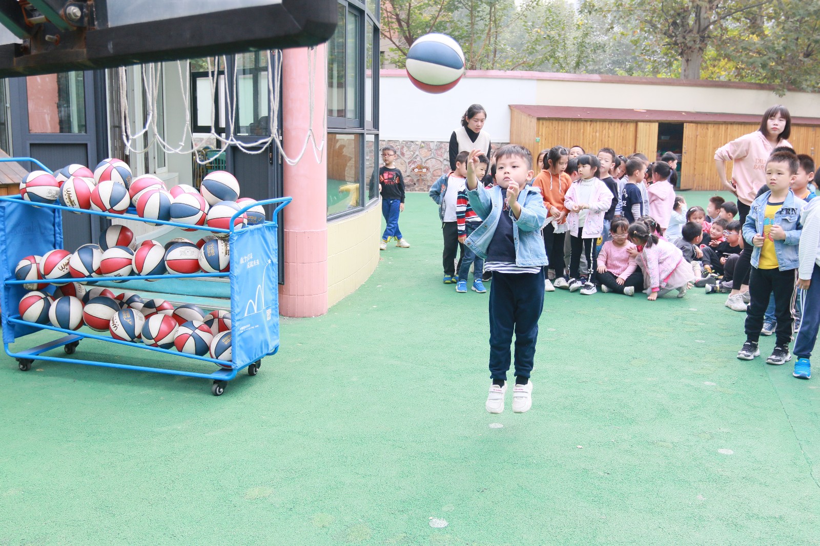 大班举办的是投篮比赛。比赛为淘汰制,小朋友们一个跟着一个有序投篮。瞄准——投球——“嗖”!篮球投入篮筐和篮网碰撞发出一声脆响,又进球啦!孩子们脸上挂满了开心的笑容。