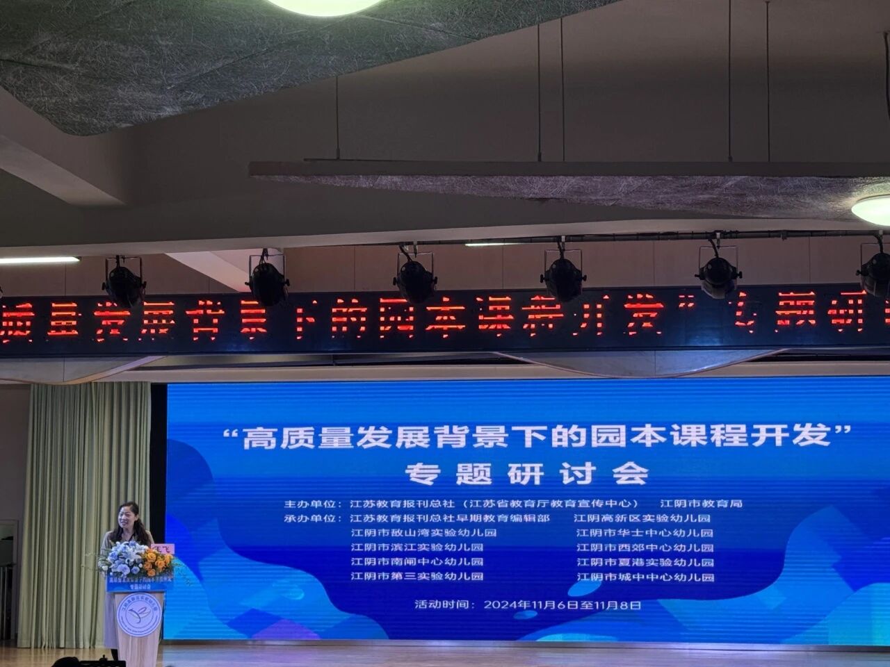 落地江阴,安排好入住,大家便满怀期待赶赴“高质量发展背景下的园本课程开发”的第一站——江阴高新区实验幼儿园(双牌园)。走进该幼儿园,通过园所环境和课程成果展示,便可深深感受到该园扎实的园本课程实践、前瞻的课程理念落地与大胆创新的探索。除了发人深思的精彩现场,更让大家为之振奋的是下午专家云集、传经送宝的学习培训活动。在江苏教育报刊总社(江苏省教育厅教育宣传中心)与江阴市教育局的精心安排下,大家有幸聆听了华东师范大学教授、博士生导师钱雨带来讲座的《项目课程视野下的园本课程建设》;江阴市教育局干事、基础教育副科长冯竹君讲座分享《幼儿园课程游戏化改革实践的江阴之声》、江阴高新区实验幼儿园教育集团总园长俞丽的《从“有质量”到“高质量”——江阴高新区实验幼儿园“润美”课程的传承与创新》;南京市栖霞区第一实验幼教集团、栖霞区教师发展中心副校长王飞立足区域层面进行《基于办园文化下的课程建设》分享;徐州市第一实验幼儿园党支部书记、江苏省特级教师方红娣带来的《从补偿性课程到支持性课程——实幼十年融合教育研究的思与行》;苏州昆山市绣衣幼儿园党支部书记、园长、江苏省特级教师蒋晨带来的园本课程分享《幼儿园快乐运动课程的建构与实践》。各位专家,从不同视域和角度、不同在地资源的利用情况、不同园本课程特色的开发与建设,进行了高质而全面的分享,大家感慨于课程改革十年,各位专家、园长们的深耕细作、精研躬行,丰硕的成果、傲人的成绩,不是课程探索的结束,而是一个新的起点和开始;同时,大家也深思于在园本课程开发与实践的路上,要保持终身学习的态度,研思并行、大胆探索、勇于创新,才能让课程开发在“破”的合理性上“立”的住、行的稳、研的深。