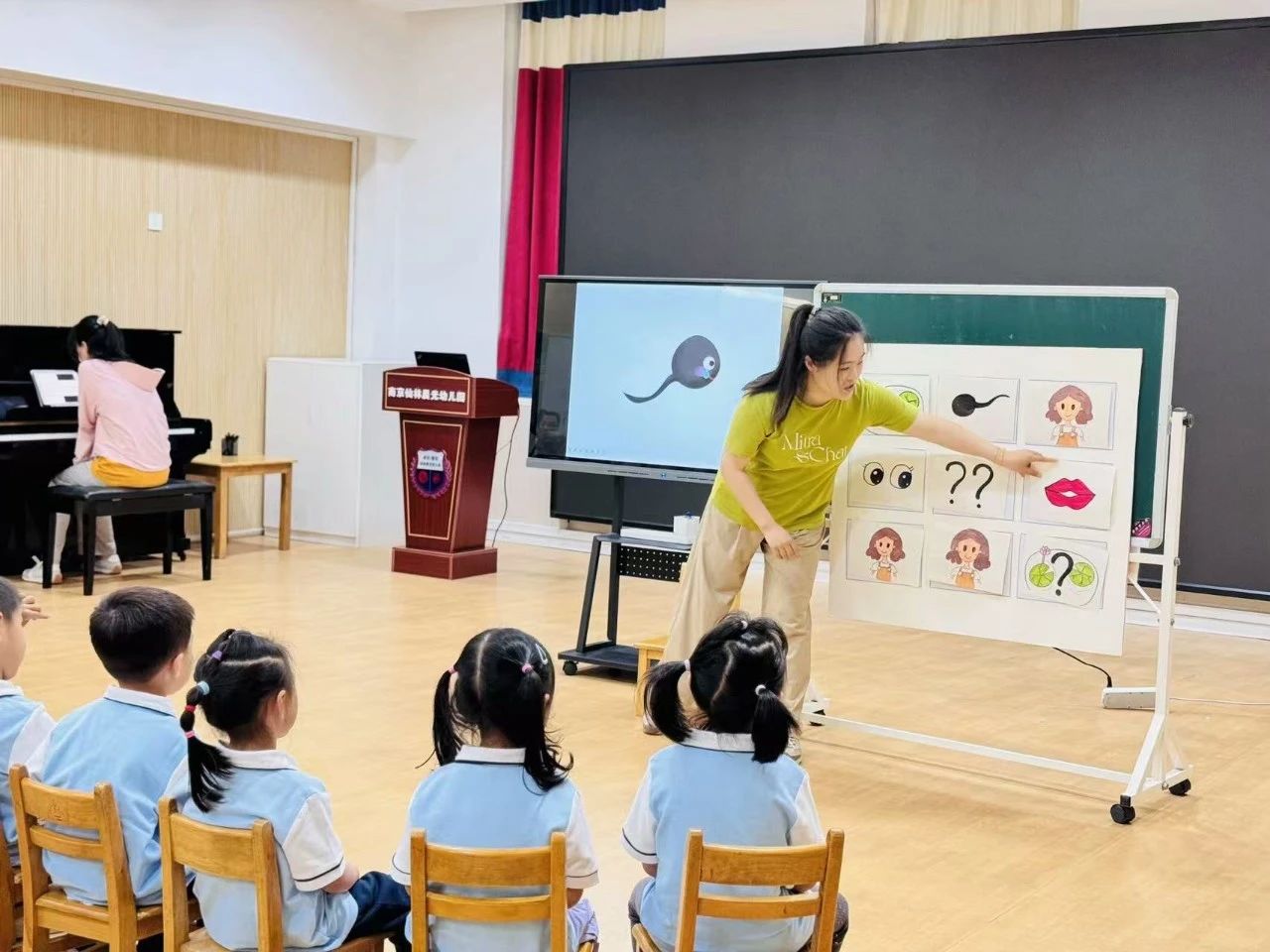 栖霞区迈皋桥幼儿园陶颖老师执教的《小蝌蚪找妈妈》,以经典童话《小蝌蚪找妈妈》为载体,通过小蝌蚪找妈妈情境,理解歌词内容,结合歌唱与简单的体态律动,在情境中感受音乐、在游戏中学习歌唱的目标,引导幼儿感知在帮助小蝌蚪找妈妈过程中锲而不舍,助人为乐的品质,幼儿对故事和音乐的结合体现了浓厚的兴趣。