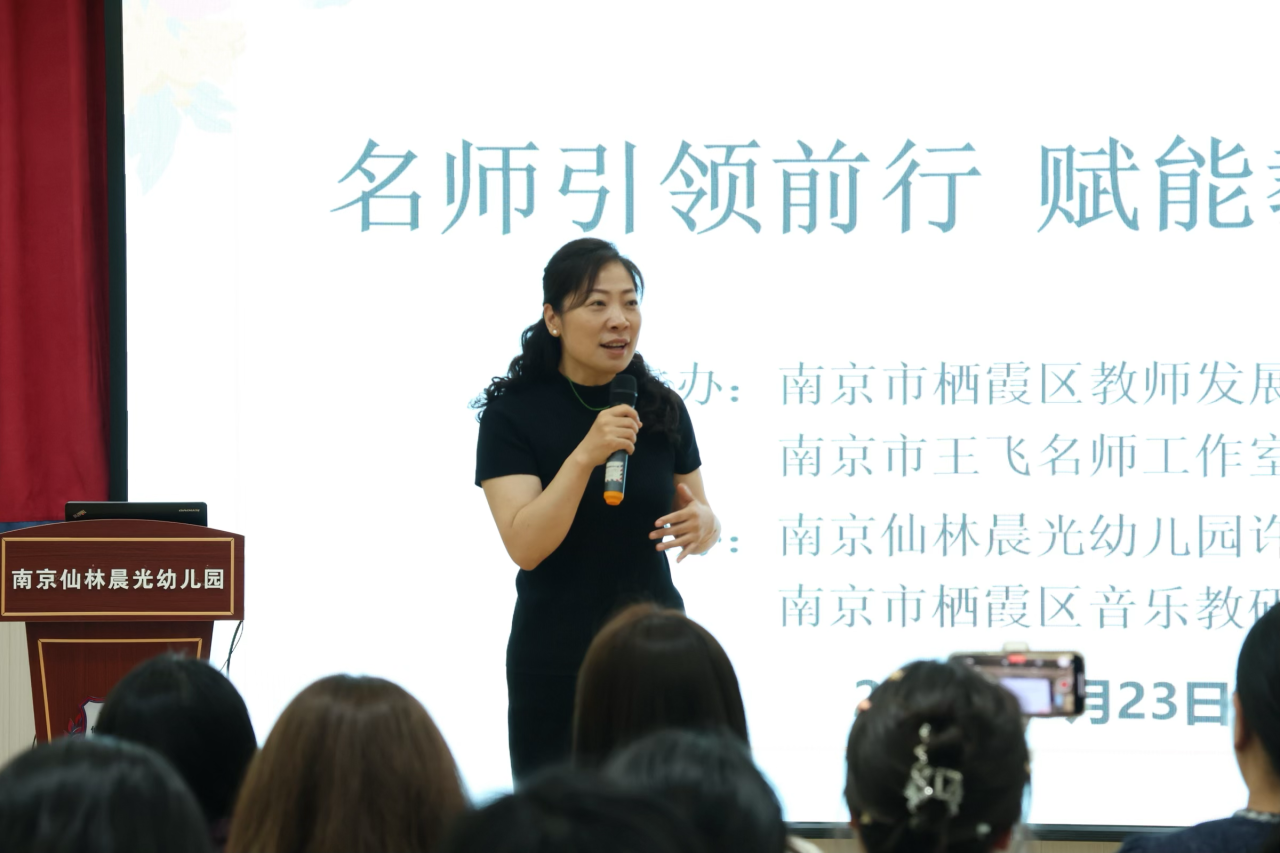 为了进一步贯彻落实《指南》精神,深化幼儿音乐活动的教学实践与研究,拓展教师音乐活动的创新思维,激发幼儿对音乐文化的感知与热爱,促进教师在音乐教育领域的专业素养提升,2025年5月23日上午,我们有幸邀请到南师大学前教育研究所所长兼学前教育学系主任许卓娅教授莅临指导,区教师发展中心王飞副校长、学前教育研训处王姗姗主任、德宝集团总督学张颖园长、音乐组全体成员及南京市王飞名师工作室成员齐聚南京市仙林晨光幼儿园开展本学期第三次教研活动。