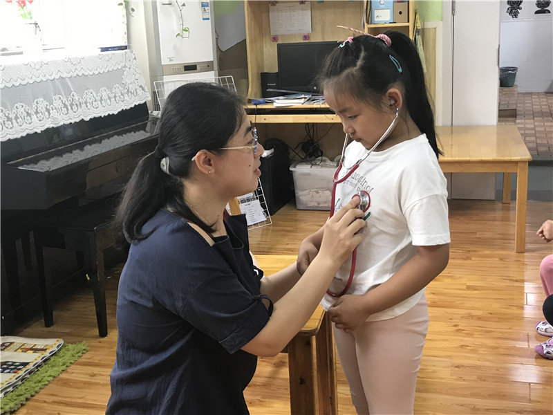 大四班邀请了许清妍妈妈作为家长助教,她是一名医生,在活动中展示了各种医疗设备,让孩子对医院有了进一步认识。
