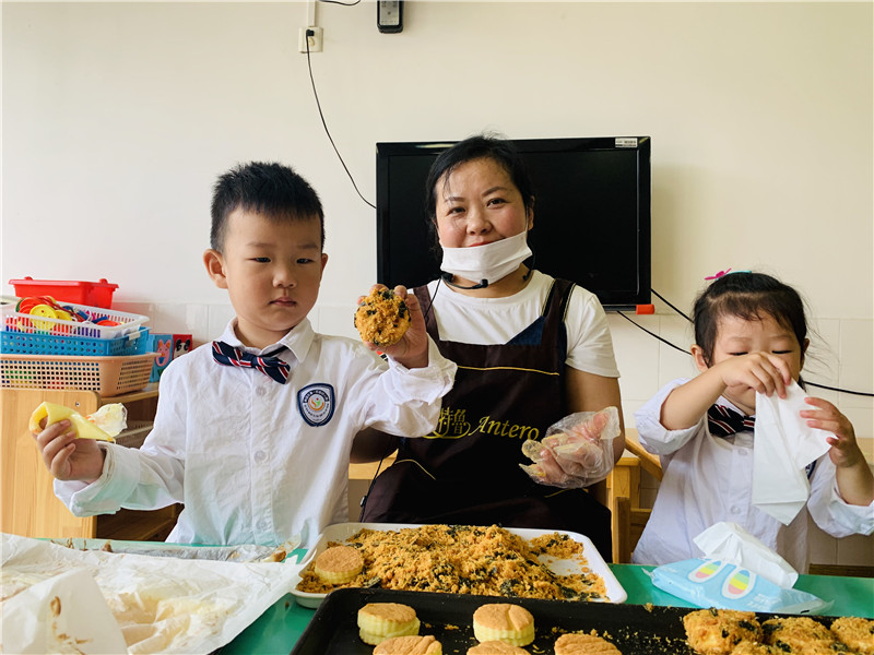 中五班邀请了杨钰钦妈妈,杨钰钦妈妈通过故事、图片、让孩子们了解中秋节的来历及传说。在愉快的氛围中,共同做出了美味的月饼。