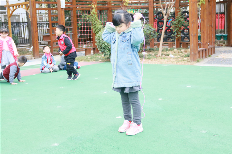 1121日上午,尧佳园大班组举行了一场紧张、激烈的跳绳比赛。活动前,全体幼儿在伏老师的带领下进行了热身运动,随后各位小选手准备就绪。比赛限时60秒,大班5个班级15名幼儿轮流来到操场中央,每位幼儿对面有一位评委老师帮助计数。裁判口令一响,幼儿立即起跳,荡起绳子像波涛,孩子们脚步灵巧,就像一条条小鱼儿在水中闹。